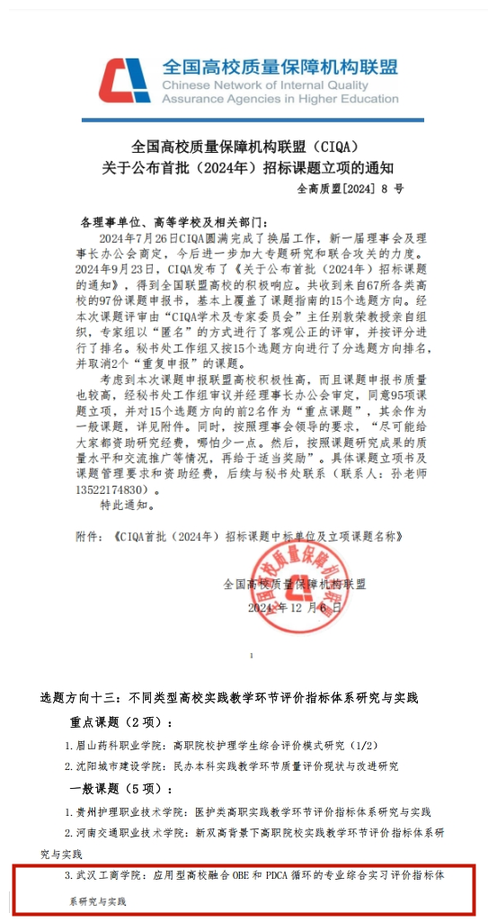 新闻中心讯(记者 芮雨欣)近日,全国高校质量保障机构联盟(CIQA)公布了首批(2024年)招标课题立项的名单。由AWC万象城娱乐教学质量监测与评估中心副主任吕凯波主持申报的课题《应用型高校融合OBE和PDCA循环的专业综合实习评价指标体系研究与实践》获一般课题立项,学校成为湖北省同类高校中唯一获该课题立项的单位。