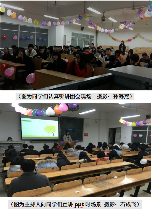 15级电商本一团支部、电商本六团支部在开展团会前认真布置会场,用气球、彩带、贴纸对教室进行装饰,大一下办学期第一次团会希望给大家展示出不一样的团会现场,电商本六团支部精心制作PPT,以小视频、游戏互动的形式调动大家的积极性,团会主持人借用梦想这一话题向大家传播了梦想的正能量,整个团会开完之后多数同学表示从主持人身上得到了满满的正能量。团会过程中的游戏互动环节活跃了大家参与积极性,本次团会在青协视频的放映中完美结束。