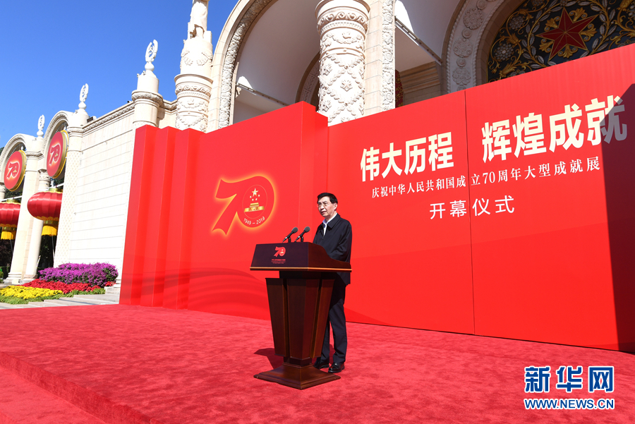 9月23日,“伟大历程 辉煌成就——庆祝中华人民共和国成立70周年大型成就展”开幕式在北京展览馆举行。中共中央政治局常委、中央书记处书记王沪宁主持开幕式并宣布成就展开幕。 新华社记者 饶爱民 摄