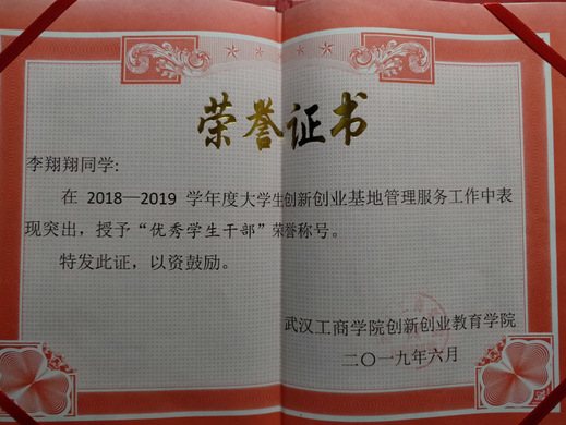 自从入校以来一直担任18电商本5班长一职,始终以一名学生干部的身份严格要求自己。学习上不断进取,工作上踏踏实实,不断提高自己的综合能力。在工作方面:热心学生工作,积极协助辅导员管理班级的日常事务,做事不拖拉,以“今日事,今日毕”为原则。作风严谨正派,发挥模范带头作用。组织班级同学参加丰富多彩的校园活动。极大地丰富了同学们的课余生活。得到了老师和同学们的信赖和肯定。在学习方面:能够勤奋刻苦,注意提高学习效率,培养自主学习的能力,不断学习新知识,扩展自己的知识面,并在一年两次考试中平均分都达到了八是多的好成绩。荣获“2019年度校级优秀班干部”荣誉称号。他一直想着上完大学后能自主创业,