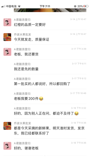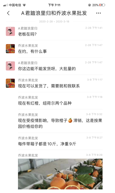 每年陈铭君都会参与学校组织的“电商下乡,扶贫助农”活动,在活动中了解到农民品质优良的果子销售不出去。这次疫情她也联系到了宜昌市秭归县的果农,并通过物流运输的方式将因受疫情影响导致滞留的2000多斤的红橙运输到了武汉进行销售。