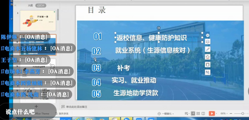 首先,辅导员主持讲话说明了此次主题班会的目的与重要性,辅导员分别从生命教育、绿色校园、毕业要求、补考、生源地助学贷款办理与回执提交、返校安排、社会实践(创新学分)的推进、大四实习等多方面进行详细的讲述。