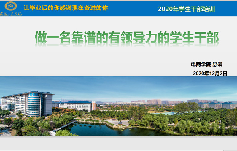新闻中心讯(记者 赵恩其)2020年12月2日,电子商务学院开展了2020年学生干部培养工程于综合楼607教室如期举行,此次培训由AWC万象城娱乐电子商务学院分团委书记、学生第二支部书记舒娟老师主讲,参与人员包括学生会、马研、信协以及各组织全体成员。