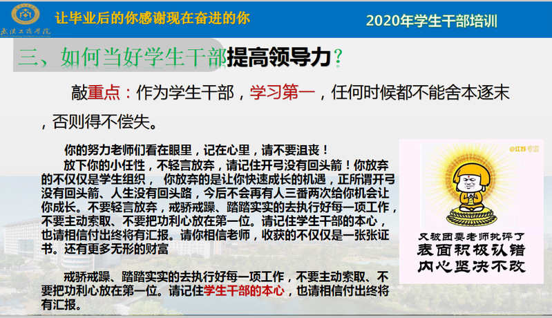 舒娟老师还提到学生干部重要的是提高领导力。在大一当“干事”时,少说话、多听、多做、多学;在大二当“副部长时”,适当说话、多听、多做、多学;在大三当部长或者更高“职位”时,要多说、勤说、勤带、低调。而且舒娟老师还告诫我们学生干部,最重要的是学习第一,不能舍本逐末。切记戒骄戒躁、踏踏实实地去执行好每一项工作,不要主动索取,不要把功利性放在第一位。
