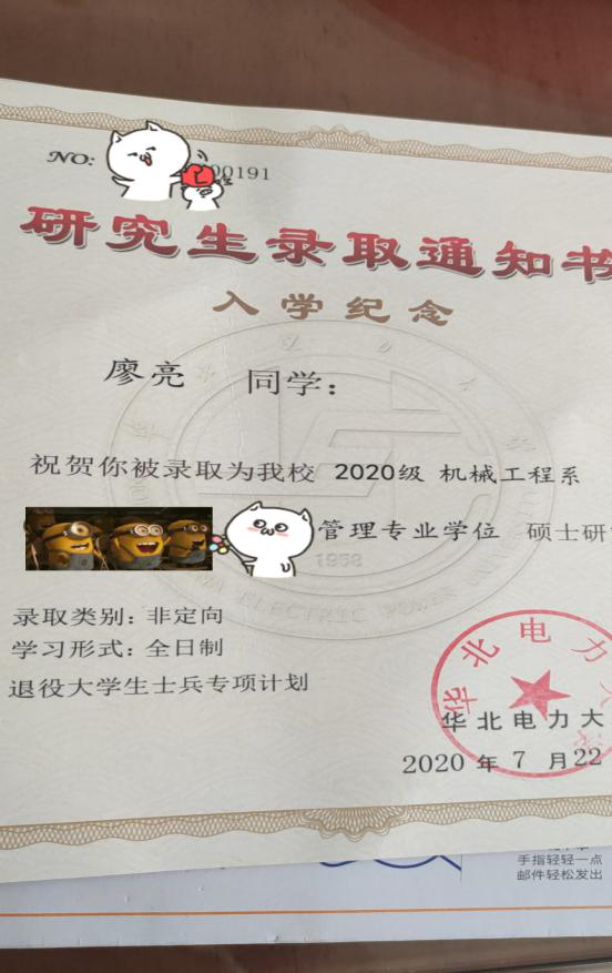 为了继续学习专业知识,我积极备考2020年硕士研究生考试,虽然面临着年龄的压力,未来的路也是很迷茫,但这也更加坚定了我考研的决心,自己想着,参军的艰苦历程都能坚持下来,还有什么可以难倒我的,考研期间,自己几乎每天按时六点半起床,七点半准时开始学习,一直到晚上十点图书馆关门才离开图书馆,考研磨练的更是自己的意志,期间面临着工作和家里不理解的压力,同时,考研的竞争一年比一年激烈,不过既然选择了考研这条路,就要坚持走到底,怎么能半途而废,最后,虽然一志愿中国科学技术大学落榜,但最后很幸运的达到了华北电力大学这所211高校的要求,最终考取了华北电力大学机械工程系硕士研究,在考研如此激烈的情况下自己可以荣幸调剂到华电,或许也是前期努力的结果。