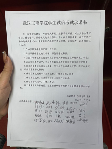 为加强学风建设,严肃考风考纪,维护学校声誉,树立学生遵纪守法。诚信做人的良好形象。本人在此郑重承诺:在学校举办的各大考试中,严格遵守考试纪律,诚信应考,并认真做到以下七点: