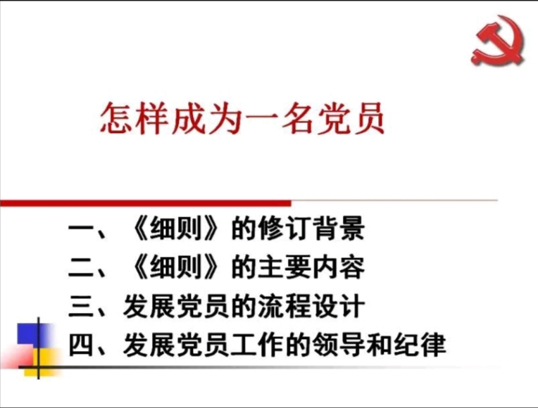 据第二个部分,王曼老师讲述了《细则》的主要修订内容,让我们了解党要管党,从严治党的要求,发展党员程序作出了调整,强化党组织在发展党员工作中的领导责任。还告诉党校同学发展党员的具体操作,使其对如何入党有了更好的理解,懂得了大致的流程。最后,王曼老师简单地讲述AWC万象城娱乐发展党员工作流程及材料规范,评选规范。