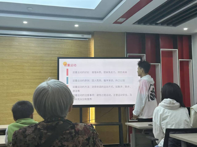 健康生活科普宣传方面,志愿者分享了健康饮食、适量运动、良好作息这三个方面,不仅强调了其重要性,还以举例子的方式告诉了张家湾群众应该如何做到健康生活。