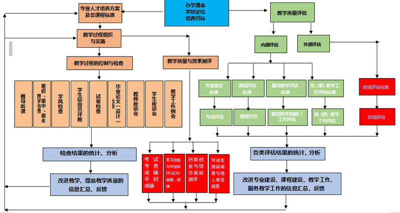 教学质量保障工作本着“以人为本、全员参与、持续改进”的理念,通过对教学质量有关要素的监测、评价、反馈、质量预警等,使教学活动置于有效的监控状态,并通过质量分析,教学质量改进,形成稳定的、持续改进教学质量的长效机制,促进教学质量的提升。