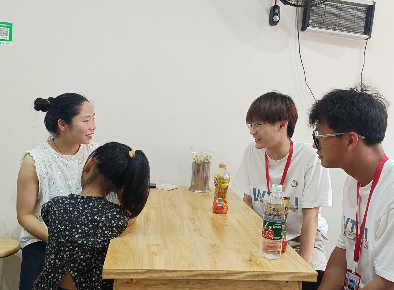 图为志愿者与王淳柳家长了解情况 摄影:胡玮劼