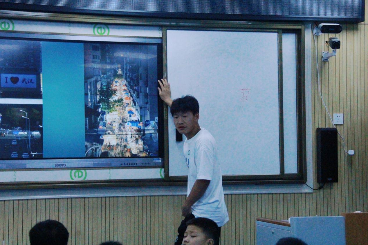 图为志愿者为同学们介绍武汉的繁华景象 摄影:向天申