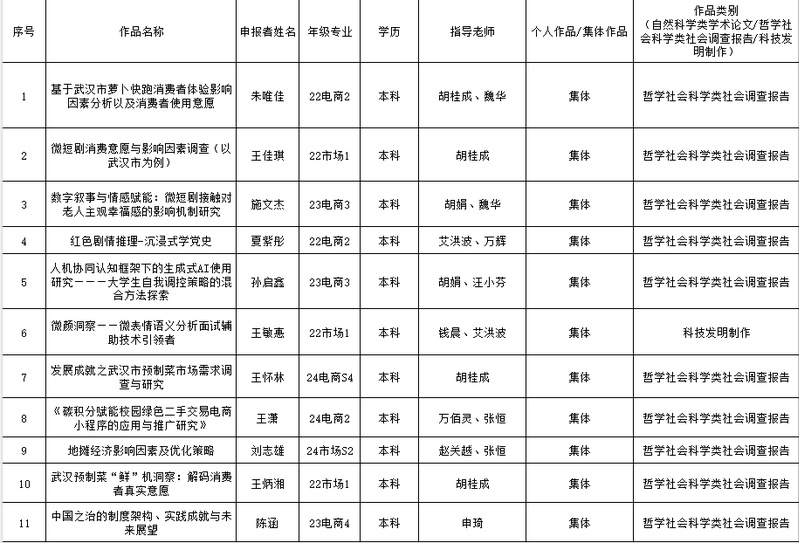 本次选拔赛的成功举办,不仅为青年学子搭建了创新实践的成长舞台,更为推动电商领域产学研深度融合注入新的活力。经过激烈角逐与专业评审,电子商务学院十五届挑战杯院赛圆满落幕。最终,以下选手凭借出色表现脱颖而出,项目将被推荐至学校: