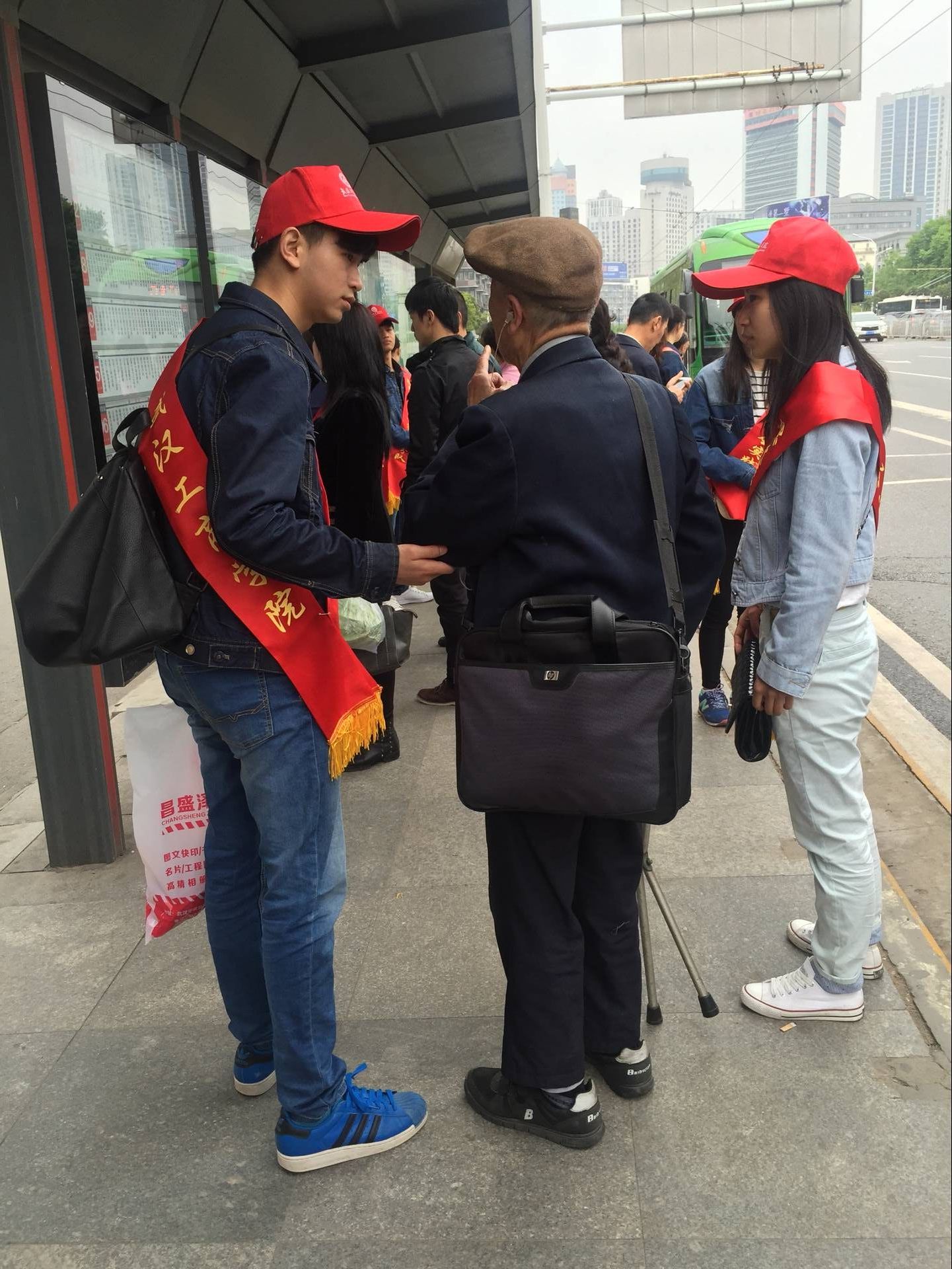 “我也要坐524路呢!怎么这么久了车都没有来?”一位白发苍苍的老奶奶恰好要乘坐同一辆车,余梦同学及时上前,扶老奶奶到公交车站的凳子上坐下,并用手机地图查询了524路公交的到站情况,“奶奶,还有6站524路才能来呢,您耐心等一会哦。”“你们都是大学生吧?利用自己周末的时间来帮助我们,真是不错呢!都是好孩子啊!”奶奶笑呵呵地夸着志愿者们。每一个志愿者在听到了奶奶的表扬后都备受鼓舞,更加积极主动的帮助乘客。看到拖着大宗行李的藏族乘客,几个志愿者都迎上前去帮忙搬行李,过往的行人都被志愿者的行为温暖了。
