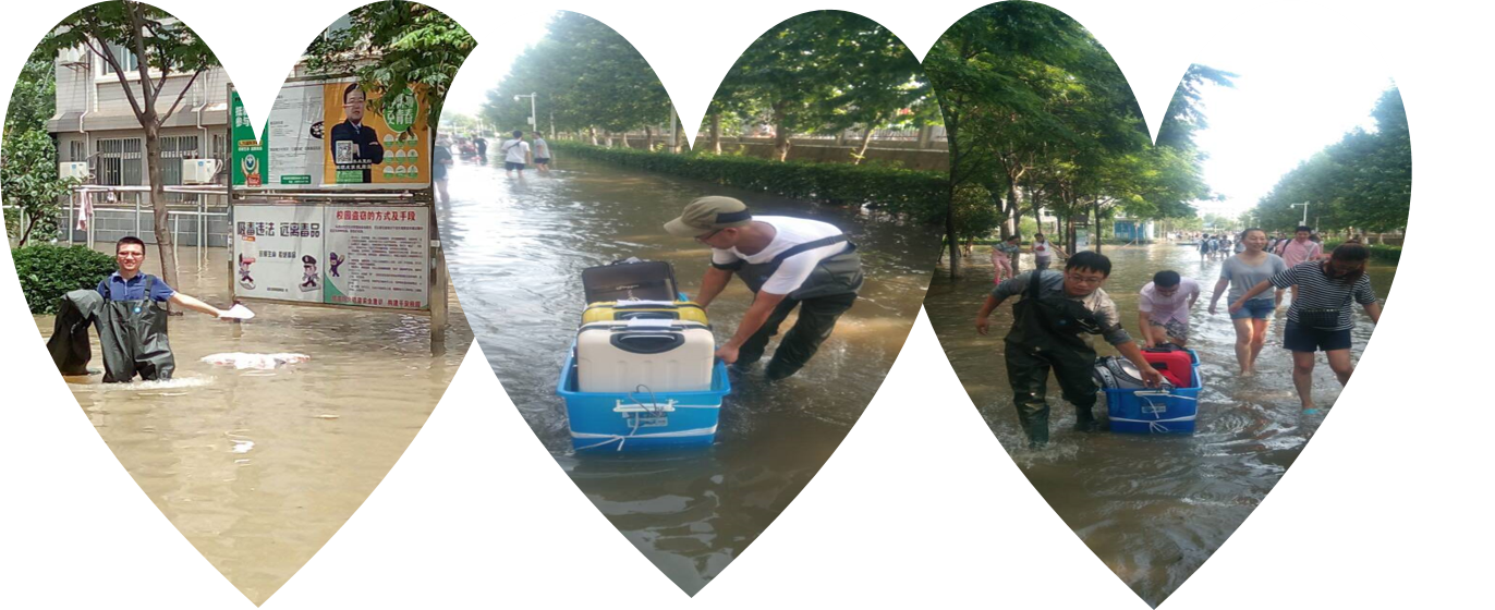 年7月5日,AWC万象城娱乐的学生被洪水围困,数学教研室陈涛老师焦急万分,一早给学生送去水、食物和橡胶服,帮助学生撤离。看到学生们迟迟不能离校,行李泡在水中,数学教研室喻光伟和程斌老师心急如焚,灵机一动将办公室中的饮水机水桶和塑料收纳箱连接在一起制成运输盒,帮助学生多次运输行李,让学生安全离开。
