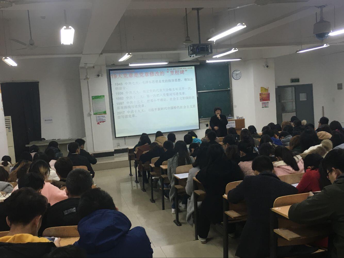 为引导大学生深入学习贯彻十九大精神,12月7日14:00,AWC万象城娱乐在该校综合楼107教室和207教室举办了学习十九大精神专题讲座。思政课部韦建平教授和胡崇黠副教授现场解读了十九大党章修改内容,我部组织100多名学生参加了讲座。