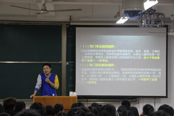 “在考研学校和专业选择中,学会差异性思维是极为重要的。”刘畅老师一开始便说道,随后,他总结了近几年考研情况,并从考研的趋势、流程、热点、择校和信息等方面做出了详细的分析。