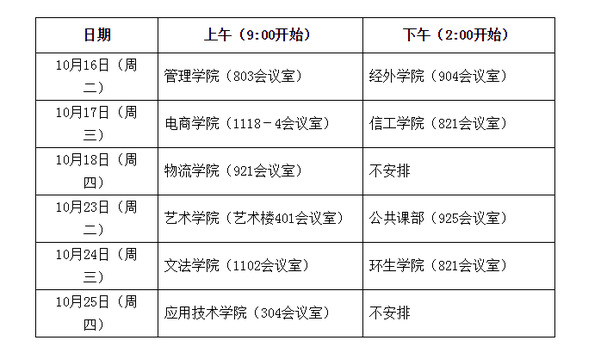 学校定于2018年10月16日 -10月25日进行院系调研工作,调研参会人员主要是各学院院长、常务副院长、教学副院长、系主任和教学秘书,调研内容为如何改善教学管理工作的问题并提出解决措施(见附件)。本次调研工作由陈校长和夏校长带队,教务部相关人员一起参与调研。
