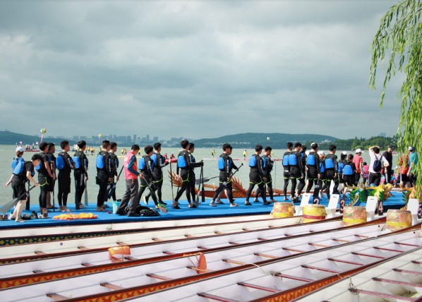 图为龙舟队队员准备登船 摄影:杜浩辰