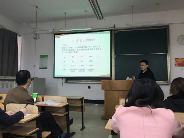 郭欢欢老师讲解了“无穷小的比较”知识点。内容有知识点回顾、引入概念、举例、小结,整个过程完整详实、过渡自然。从一个表格内容出发,形象生动地引入为什么要进行无穷小的比较,分门别类地概括出高阶无穷小、同阶无穷小、等价无穷小相关概念;重点讲解了常用的等价无穷小,并用等价无穷小替换来求极限。点评环节里,程主任对郭老师这次讲课中展现出了老师该有的自信,声音洪亮,讲出了问题的本质;讲课的整个过程流畅,建议把标题和主要内容板书出来供学生加深印象,在罗列常用的等价无穷小时应强调五类函数与幂函数的等价情况,更容易让学生理解问题本质。江小琴老师点评郭老师进步很快,建议调整一下PPT中一些内容的顺序会更有利于学生的理解。