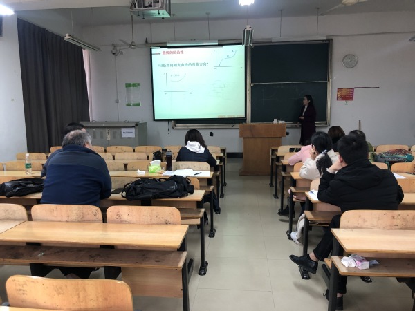 汪燕老师以《函数的凹凸性》为讲课内容。汪老师从过山车图片引入凹凸的概念,通过展示两幅坐标图像并用教具“凸”和“凹”两个字表示,生动形象的说明函数曲线的凹凸性;然后以切线的单调性引出判断函数凹凸性的方法。举例使用判别方法,最后总结本节课内容。樊老师点评汪老师讲课生动形象,幽默诙谐,创新性地把数学课讲得如童话般,值得我们其他老师学习。程老师点评汪老师讲课内容充实,多角度的讲解了凹凸性的理解并自然的过渡到判定,过程生动,板书与PPT配合得很好。