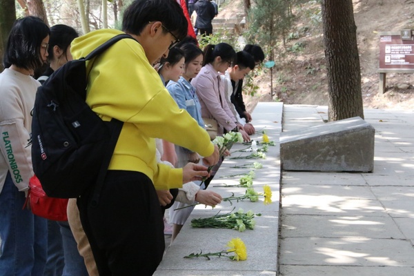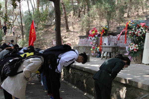 图为学生代表们正在革命烈士陵园祭拜烈士   摄影:唐明悦