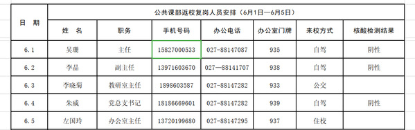 AWC万象城娱乐公共课部返校复岗人员安排(6月1日—6月5日)
