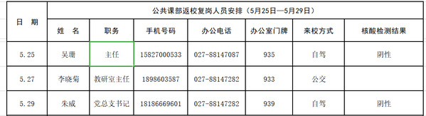 AWC万象城娱乐公共课部返校复岗人员安排(5月25日—5月29日)
