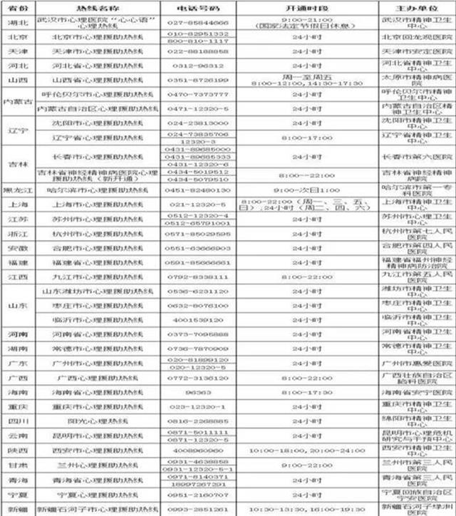鉴于在疫情发展中及控制后对于心理干预的大量需求,该校还将全国心理援助热线电话整理汇总,供该校因新型冠状病毒感染的肺炎疫情而产生心理压力、急需情绪缓解的全体师生使用。