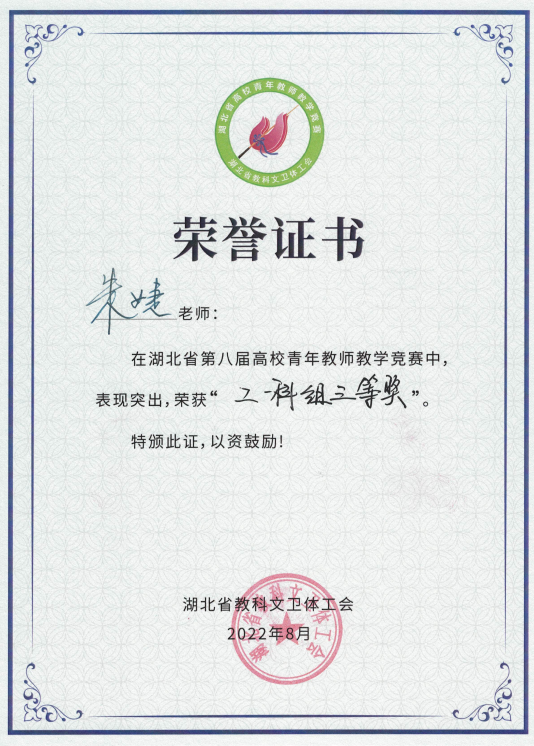朱婕老师荣获湖北省第八届青年教师教学竞赛工科组三等奖