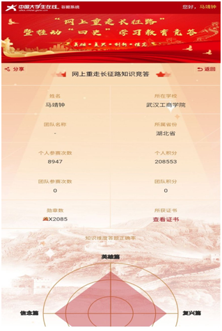 (管理学院党员服务中心讯 记者戚文静)为深入学习以及贯彻习近平总书记关于高校的党建和思想政治工作的重要指示批示精神,推动深入学习好党史、新中国史、改革开放史和社会主义发展史,持续深化爱国主义精神教育,据教育部及省教育厅要求,并结合我校实际,管理学院于2021年2月在网上开展了“网上重走长征路”等推动“四史”学习工作的活动。