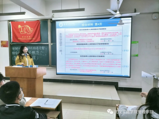本次党课的主要讲解了如何规范填写入党积极分子考察手册,汪淑怡同学讲述了综合材料说明、入党申请书和思想汇报的书写注意事项。具体如下: