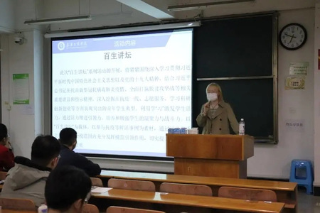 马研负责人讲解了关于“百生讲坛”的相关内容,她说:“此次‘百生讲坛’系列活动的开展,将紧紧围绕深入学习贯彻习近平新时代中国特色社会主义思想以及党的十九大精神,结合习近平总书记在抗击新冠疫情、全面打赢脱贫攻坚战等相关重要讲话和指示精神,深入挖掘在抗疫一线、志愿服务、学习科研等方面表现突出的学生。利用学‘习’激发学生活力,通过活力增加引领力,培养和增强学生的凝聚力。要以‘百生讲坛’为载体,切实提升全校青年的政治思想素质。”