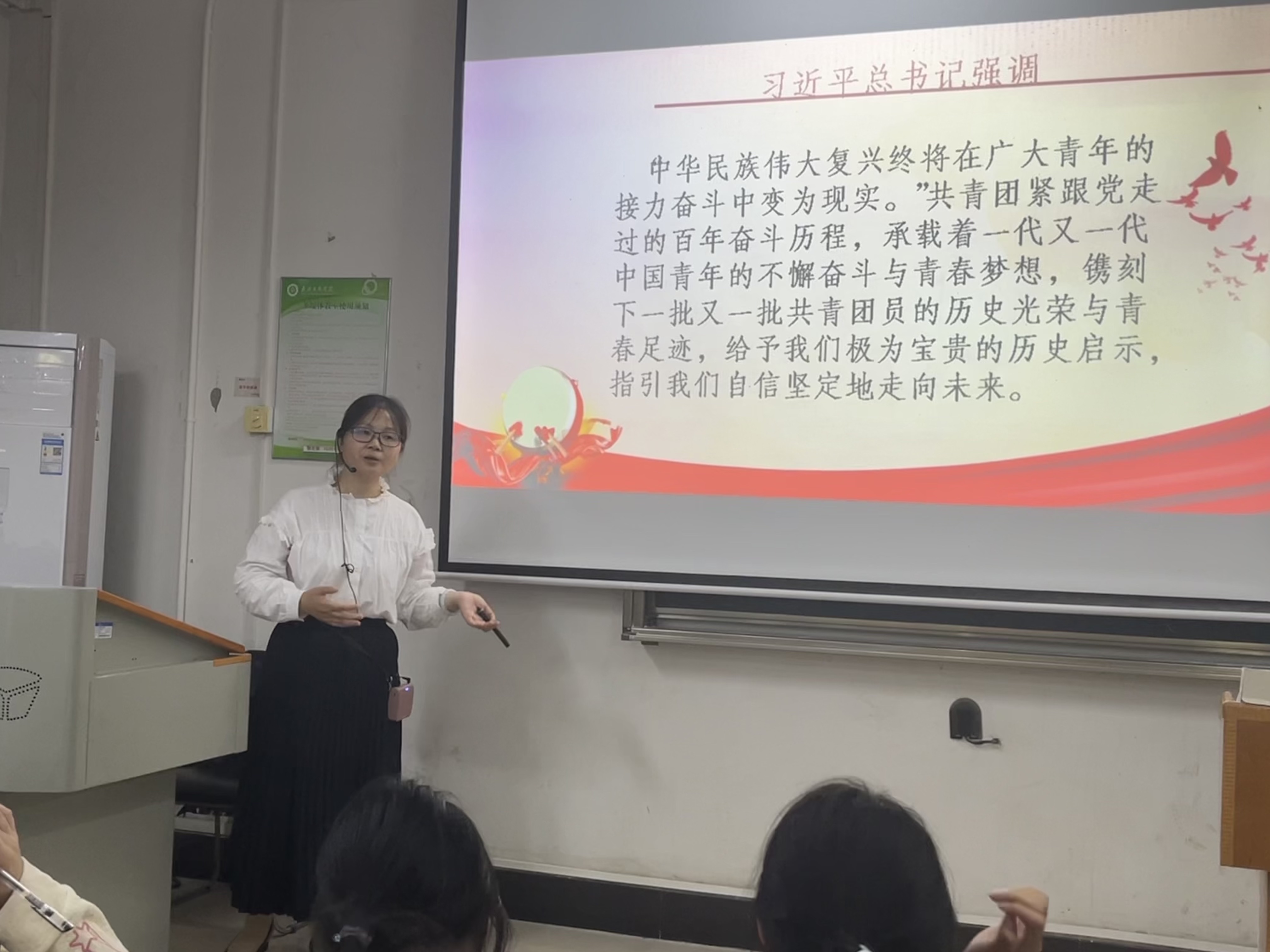 团课伊始,杨建平老师借习近平总书记的发言。讲述了中国共青团是与党息息相关的重要组织,肩负着带领一代代中国青年为实现中华民族伟大复兴的重要职责。在会议上,杨建平老师就1921年7月中国共产党成立与社会主义青年团第一次全国代表大会的召开,分别介绍了团的发展雏形与背景以及团的正式建立的历史事件。