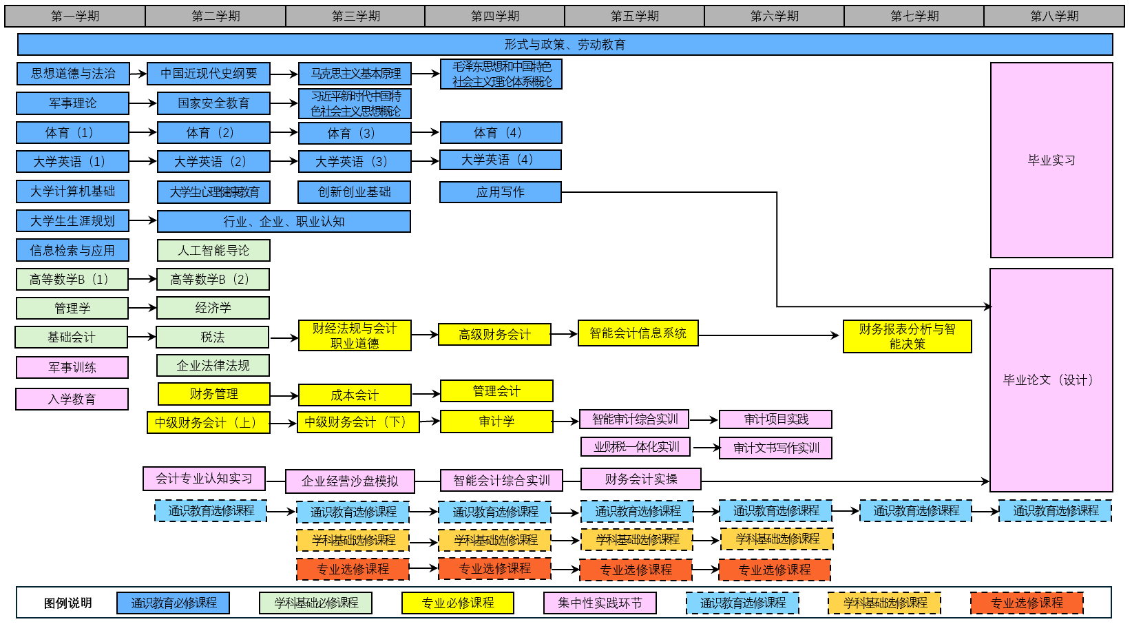 专业核心课程:基础会计、税法、中级财务会计、高级财务会计、成本会计、管理会计、财务管理、审计学、智能会计信息系统、财务报表分析与智能决策、财经法规与会计职业道德