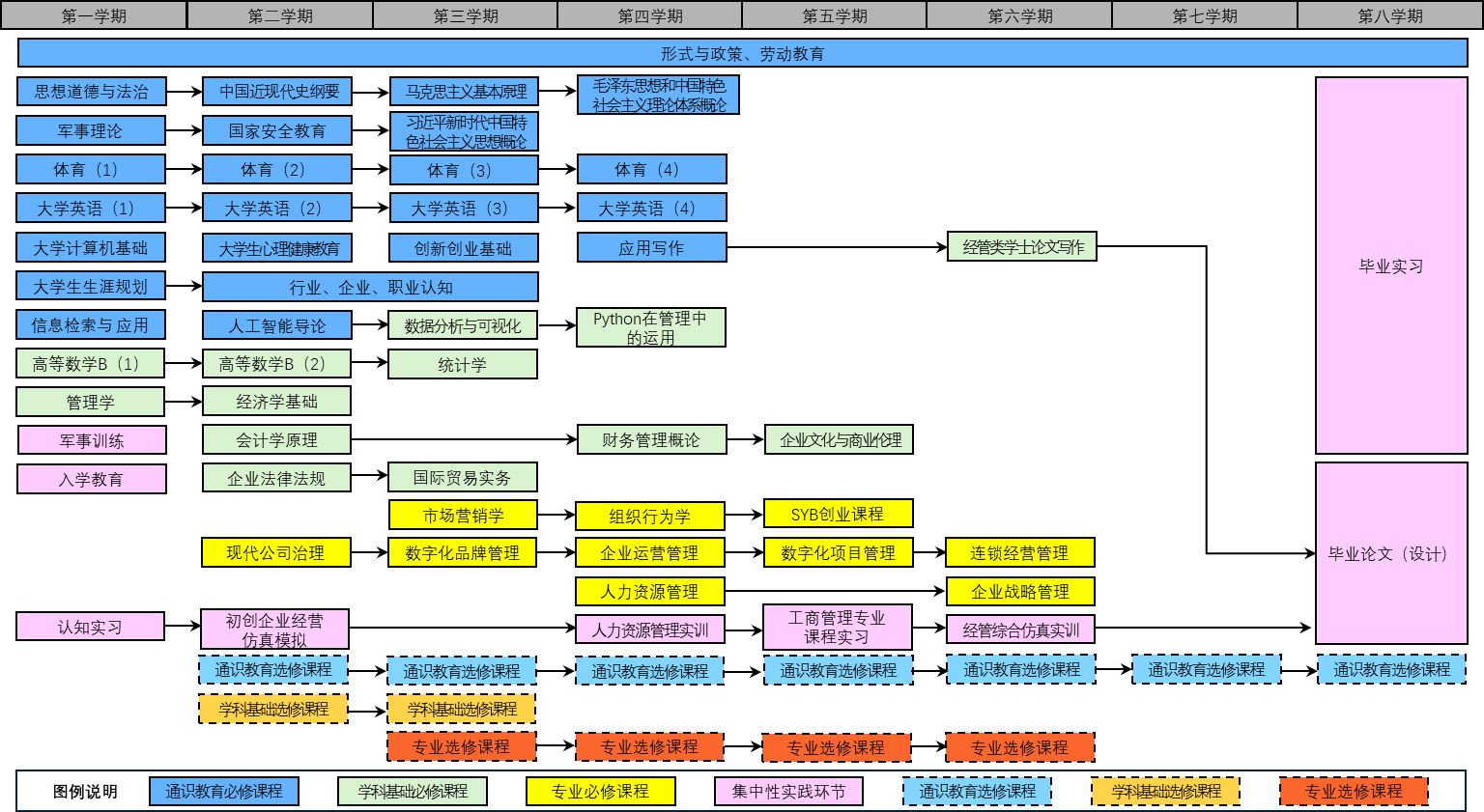 专业核心课程:管理学、数字化项目管理、市场营销学、人力资源管理、SYB创业课程、企业战略管理、现代公司治理、企业运营管理、组织行为学。