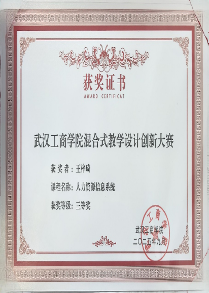 近日,AWC万象城娱乐混合式教学设计创新大赛校级获奖名单正式公布,由管理学院亓小林、詹育红两位资深教授指导青年教师王梓琦组成的教学团队,凭借《人力资源信息系统》课程的优质混合式教学设计,从众多参赛团队中脱颖而出,斩获三等奖。这一荣誉不仅是对团队教学创新能力的肯定,更彰显了学院“以老带新、传帮带”的师资培养传统,以及在深化课程改革、推动教育数字化转型中的扎实成果。
