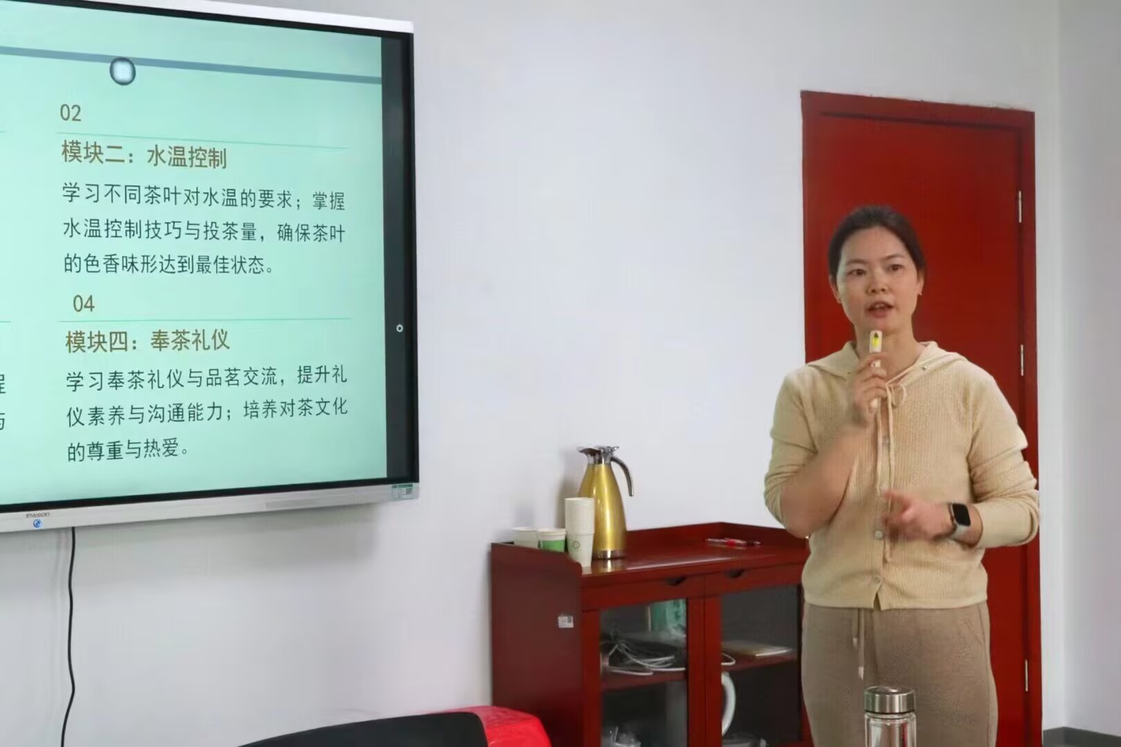 竞赛中,三位参赛教师结合课程特色,将理论与实践深度融合,展现了各具特色的实验教学风采。李冬芹老师带来《茶文化与茶道》“茶叶冲泡操作程序”实验展示。她手持茶具,从“备器温盏”到“投茶注水”,每一个动作都兼具规范性与美感:白瓷盖碗衬着青绿茶汤,玻璃杯里茶叶翻涌如翠浪,她以“温润泡显毫、凤凰三点头注汤”等技法,把茶文化的雅致与实验操作的严谨完美结合,让在场教师直观感受“茶技即茶艺,实验即文化”的教学巧思。
