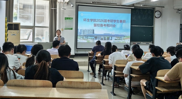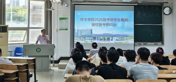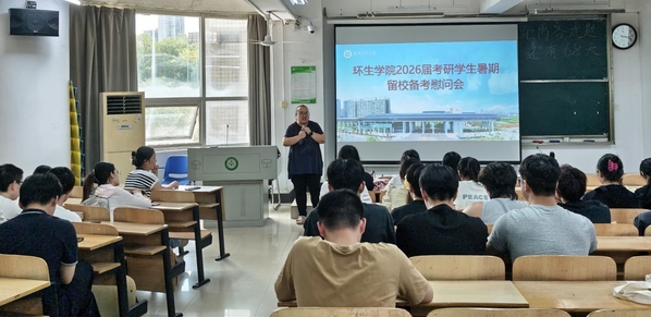 为鼓舞2026届考研学生暑期留校备考士气,缓解备考压力。2025年7月9日下午,环生学院在综合楼206教室召开2026届考研学生暑期留校备考慰问会。出席会议的有环生学院党总支副书记王强、副院长杨文婷、郑丹,2026届暑期留校考研备考学生代表50余人参加了会议,会议由2026届毕业生辅导员李杨主持。