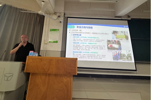 君集环境科技股份有限公司总工程师刘鲁建总工从产业视角为新生描绘了环保行业的全景图。他将行业按环境治理类别分为六大领域:水污染治理、大气污染治理、固体废物治理、危险废物治理、放射性废物治理和其他污染治理。按产业链属性和职能类别,环保行业包括环评、监测、技术、服务、制造、管理等多元方向。刘总工特别介绍了政府部门、研究机构、企业组织等各类就业单位的特点和要求。在职业发展方向上,他详细讲解了技术专业类(设计工程师、项目工程师、调试运营工程师等)、辅助专业类(设备、仪表工程师、结构工程师等)和综合管理类(商务市场、经营管理、EHS安全环保管理等)三大发展路径。