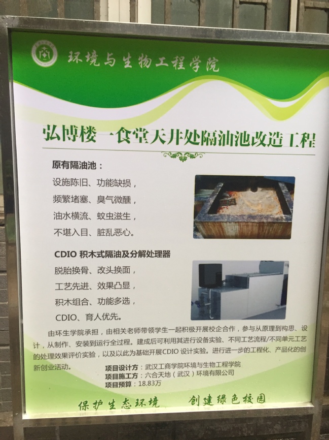 为改善天井环境,环生院牵头、后勤经营部、工程部配合,在暑期对该区进行改造施工,环生院相关老师带领学生一起开展校企合作,参与从原理到构思、设计、制作、安装到运行的全过程,预计建成后可利用CDIO积木式隔油及分离处理器进行设备实验、不同工艺流程、不同单元工艺的处理效果评价实验等。真正达到服务育人的目的。
