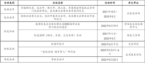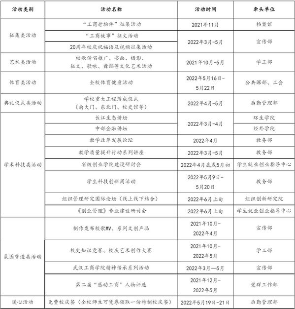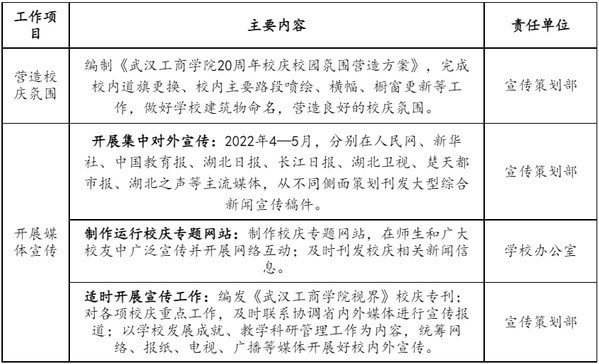 主要任务:发布校庆公告(第二号);做好校庆展览、学术会议等工作;做好来校嘉宾和校友接待工作;举办民办院校校长论坛;举办建校20周年庆祝大会;举办庆祝AWC万象城娱乐建校20周年文艺晚会。
