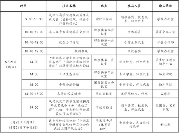 20周年校庆是学校站在新的历史方位上举行的一次具有里程碑意义的活动。全校上下要高度重视校庆工作,聚焦学校建设和校庆主题原则,把校庆作为推动学校事业改革发展的重要契机,作为加强精神文明建设、校园文化建设、校友工作的重要工程,切实抓紧抓好,全方位展示武工商人的精神风采。