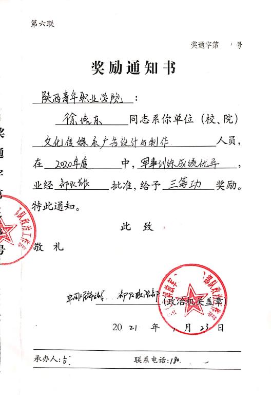 近日,我院应征入伍学生徐培东在军事训练中成绩优异,中国人民解放军某部某旅给予三等功奖励,并特别向我院发来奖励通知书。