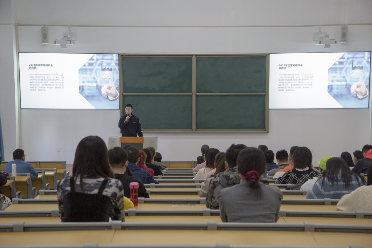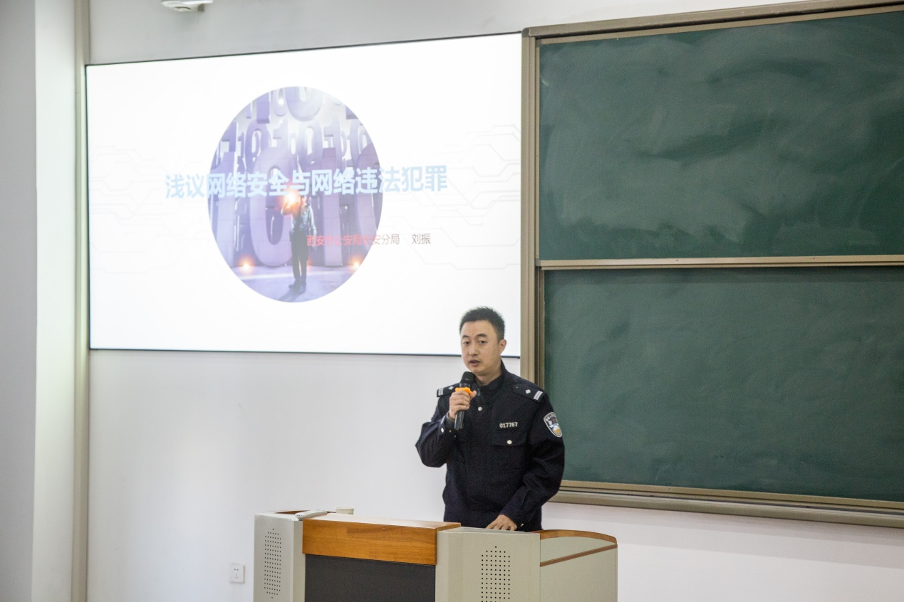 讲座特别邀请西安市公安局长安分局刘振警官,为师生讲解如何应对当前网络中存在的各类安全风险。刘振以大量详实的案例,深入浅出地分析了互联网违法犯罪的特征原理、发展趋势,并详细讲解了如何防范电信网络诈骗以及网络安全相关法律法规等方面内容。