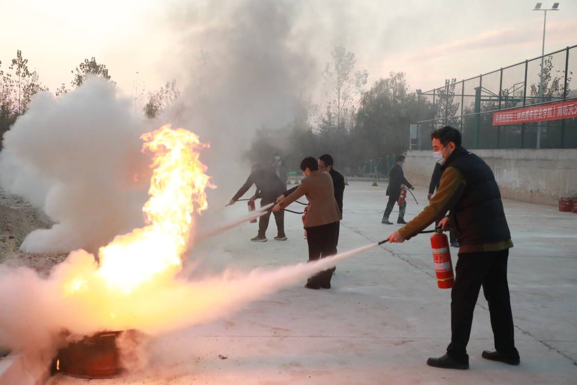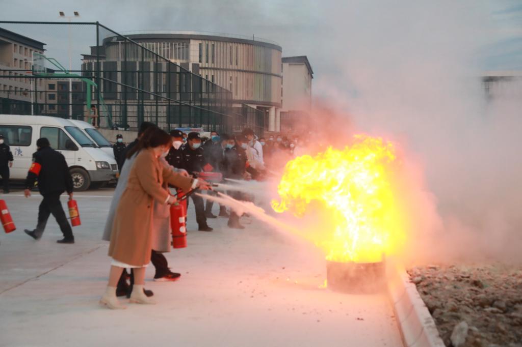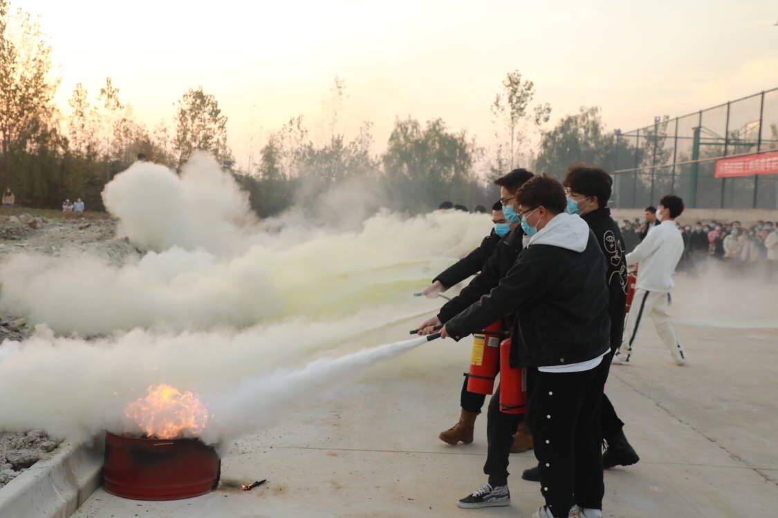 灭火演练中,教官再次向师生演示干粉灭火器的使用方法,有序组织师生员工分组开展灭火演练,按照“摇,提,拔,握,按”五个要点,迅速扑灭起火点。