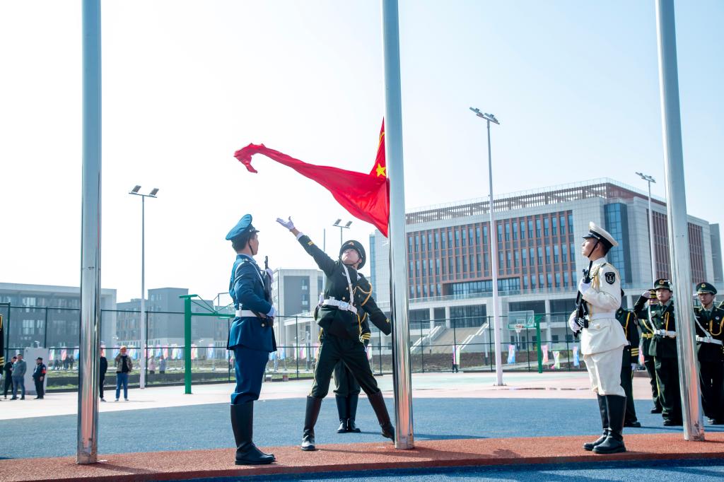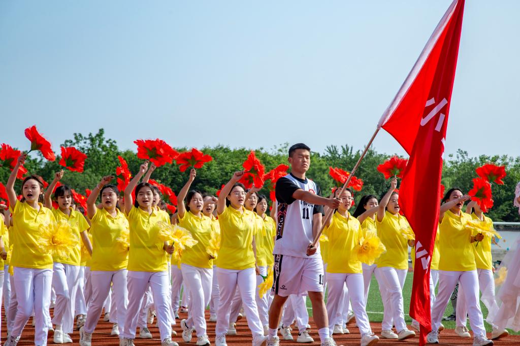 在铿锵的《运动员进行曲》中,国旗护卫队、院旗护卫队、花环方阵、裁判员方阵、各系(部)运动员代表队方阵依次入场。国旗班的升旗手们步伐矫健有力,护卫着鲜艳的五星红旗入场。伴随着《义勇军进行曲》的响起,五星红旗冉冉升起。
