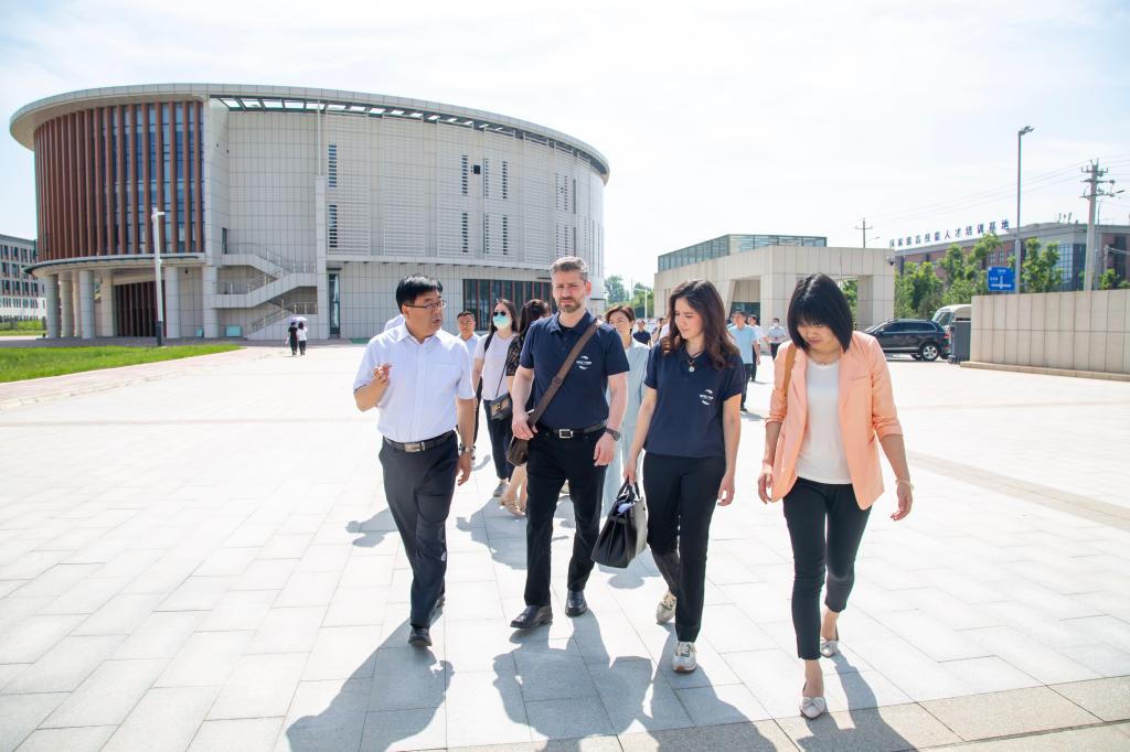 加法尔·马赫迪一行实地走访查看校(院)利用欧佩克基金进行校园基础设施建设的情况,了解项目推进进程与实施完成情况。在实训楼、教学楼,深入剪纸课、国画课课堂现场听课,观看学生进行古筝弹奏、合唱团演唱、中国民族民间舞表演及播音、配音实操,详细考察专业特色、课堂教学、实践训练、校企合作等方面情况;在图书馆查看内部建设与结构布局,浏览馆藏书库,参观书法绘画、手工工艺、创意设计等教学成果展,调研产学研融合推进文创成果转化的情况;在操场、学生生活区、餐厅了解建筑场地建设使用状况,与师生进行面对面交流,调研学生管理、校园活动、餐饮住宿、后勤保障等方面情况。