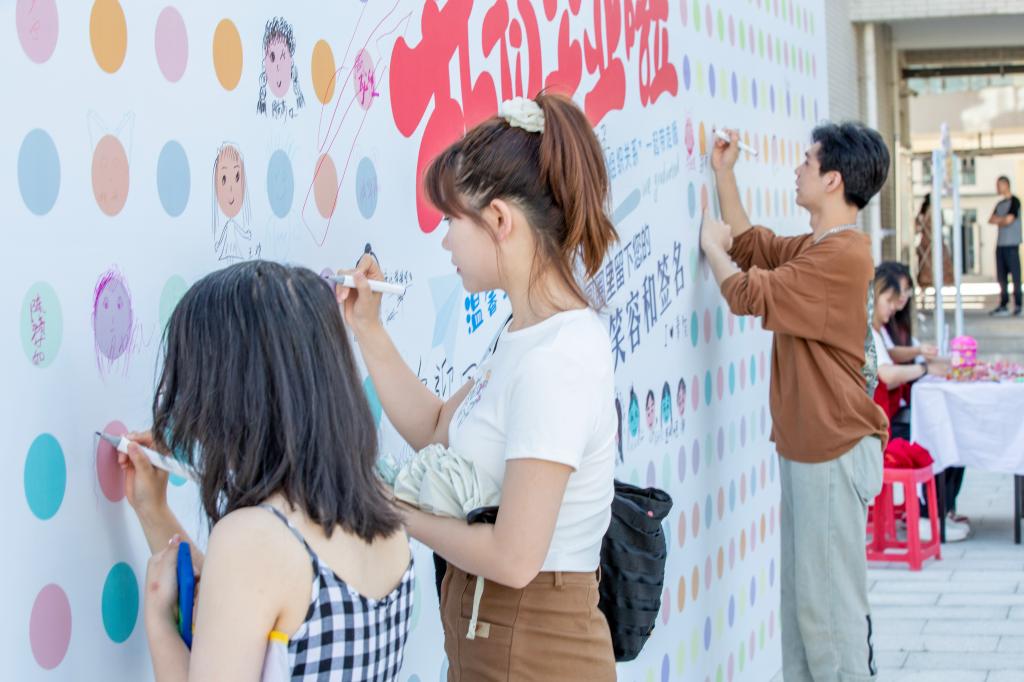 典礼前,2023届毕业生们纷纷在毕业墙布上签名并合影留念。在激昂的团歌声中,2023届学生毕业典礼圆满结束。