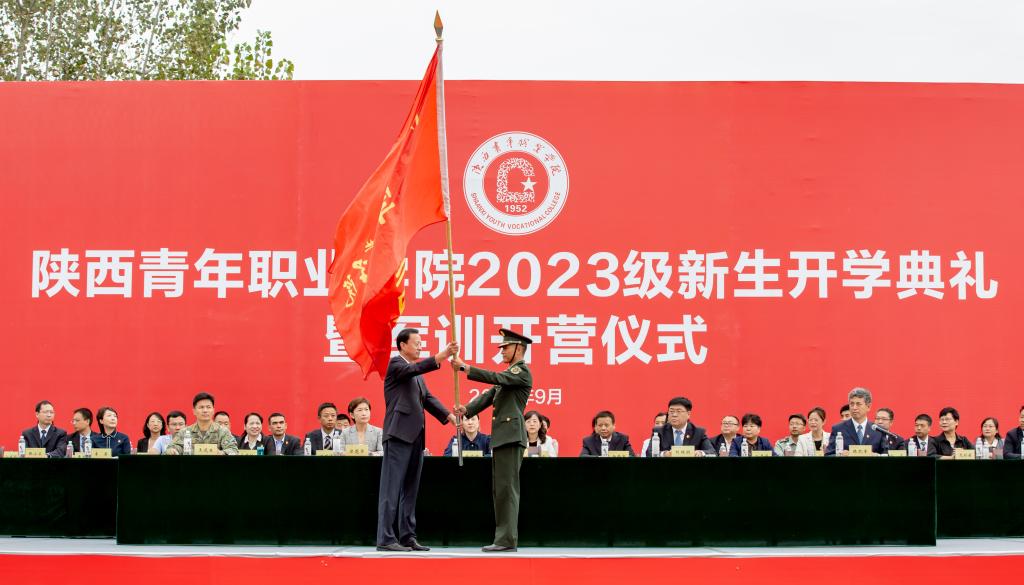 温锋科为军训团授旗。2023级新生军训正式开营。