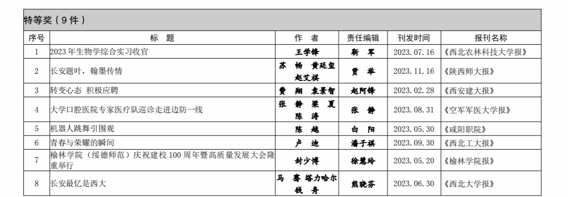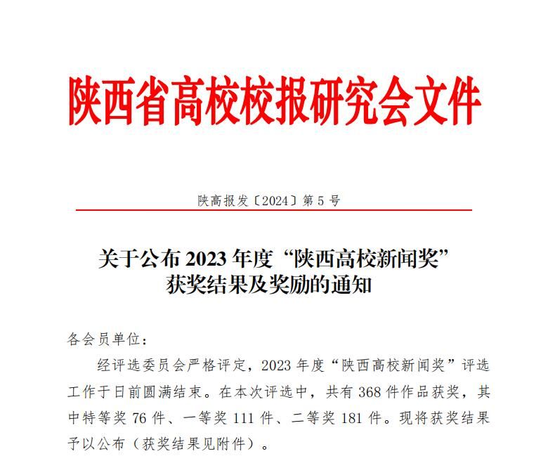 陕西高校新闻奖是由陕西省高校校报研究会组织评选,每年评选一次,评选范围涵盖消息、通讯、言论、新闻图片、新闻专栏、版面等六大类。2023年全省高校共有368件作品获奖,其中特等奖76件、一等奖111件、二等奖181件。
